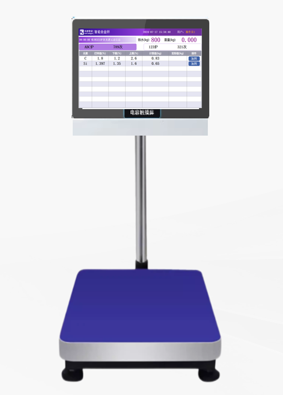 FSY-XX-TC型智能合金秤針對鑄造行業電爐熔煉輔料加入場景打造的一款工業級計量產品,集成CPU和HMI系統于一體,通過光譜檢測數據和材質標準并與智鑄云平臺、智鑄云易享版APP、熔煉云小程序等集成,精確計算合金輔料補加量,實現合金加入量數據統計、分析與查詢。