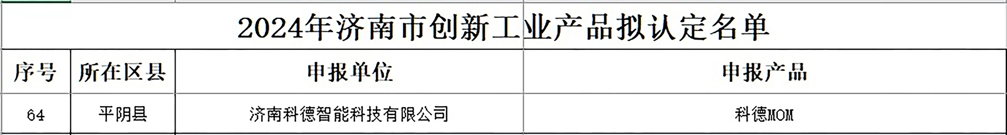 根據《關于征集2024年濟南市創新工業產品的通知》要求,經企業申報、區縣審核推薦、市工信局組織專家評審等環節,濟南科德智能科技有限公司“科德MOM”被認定為“